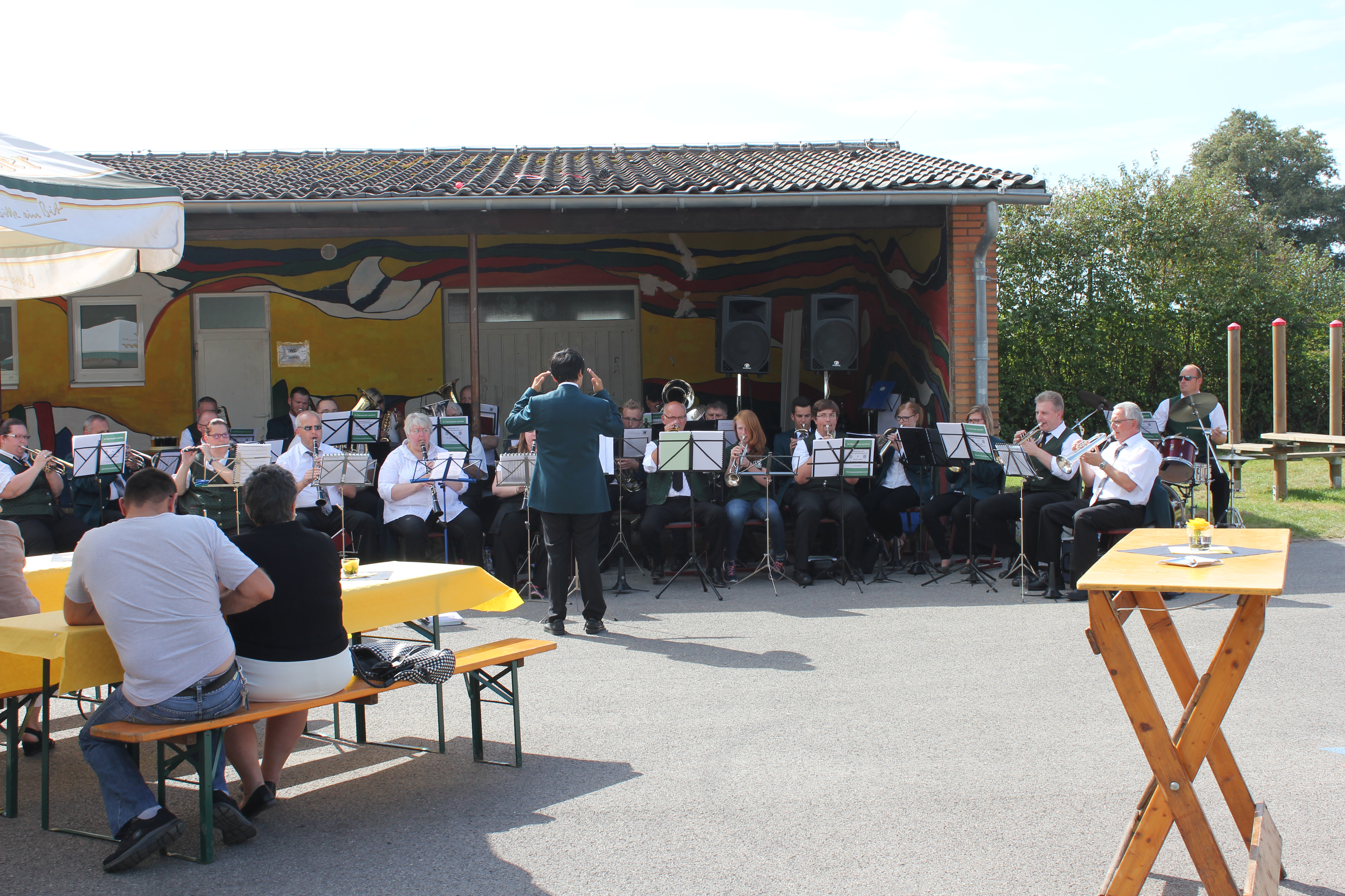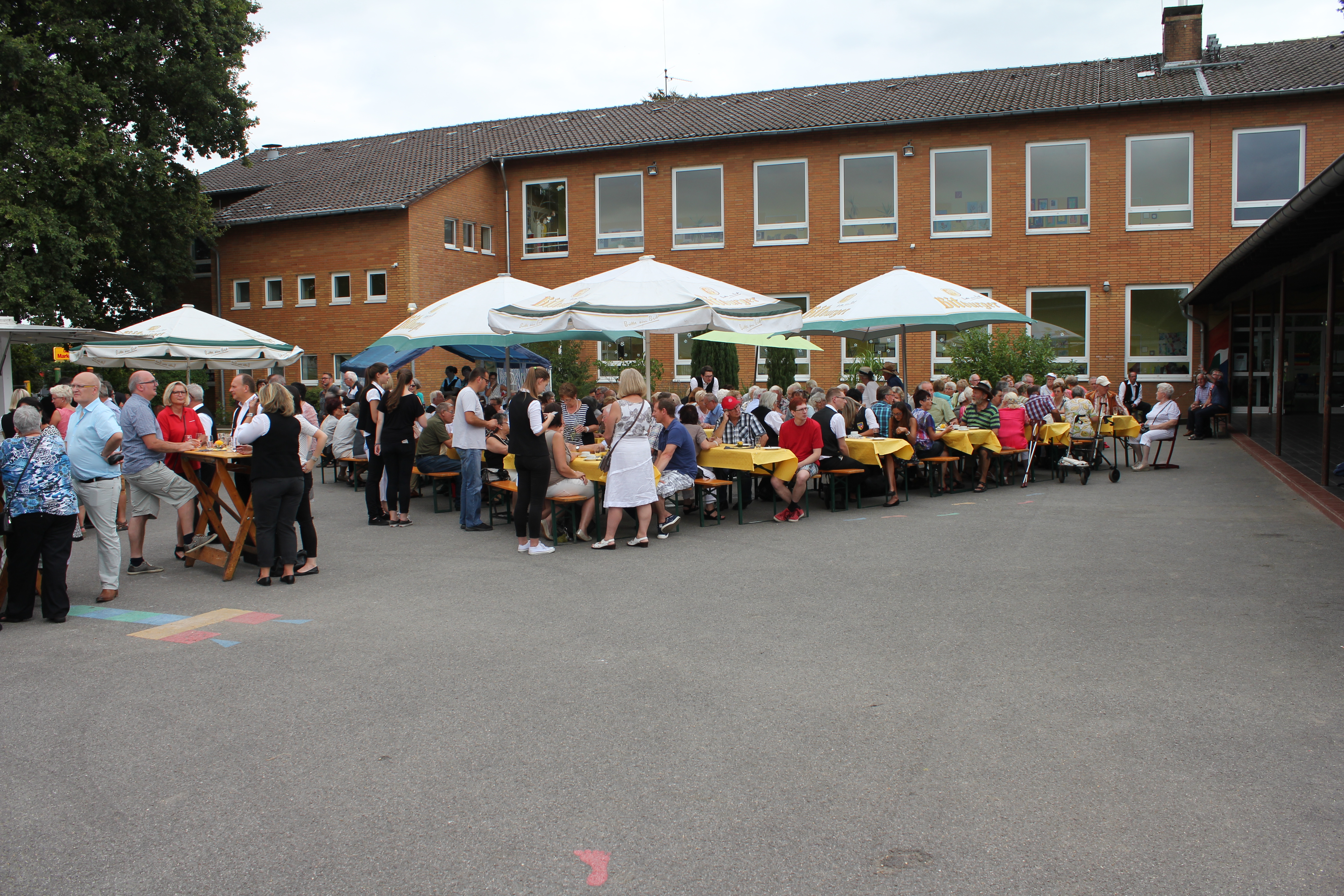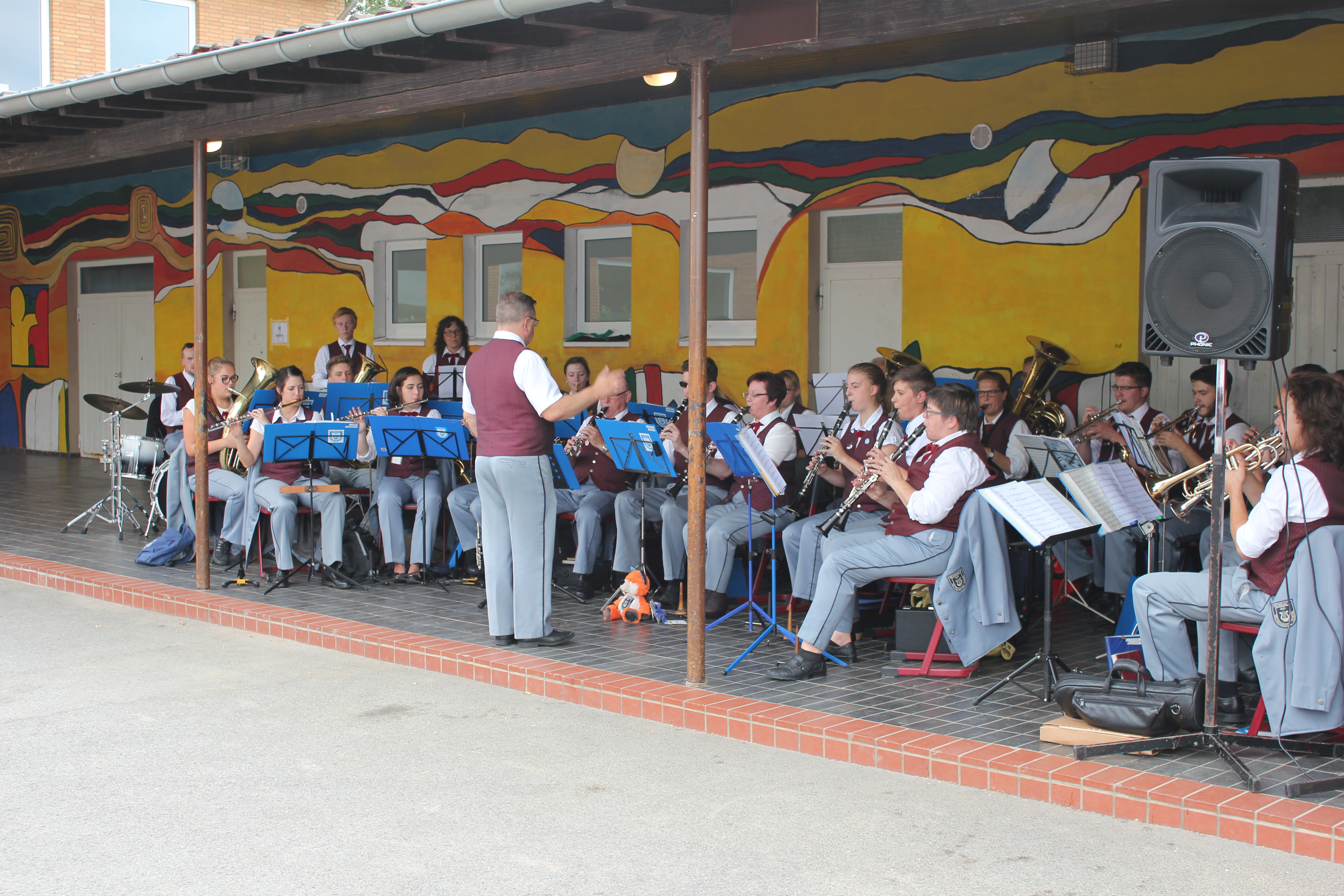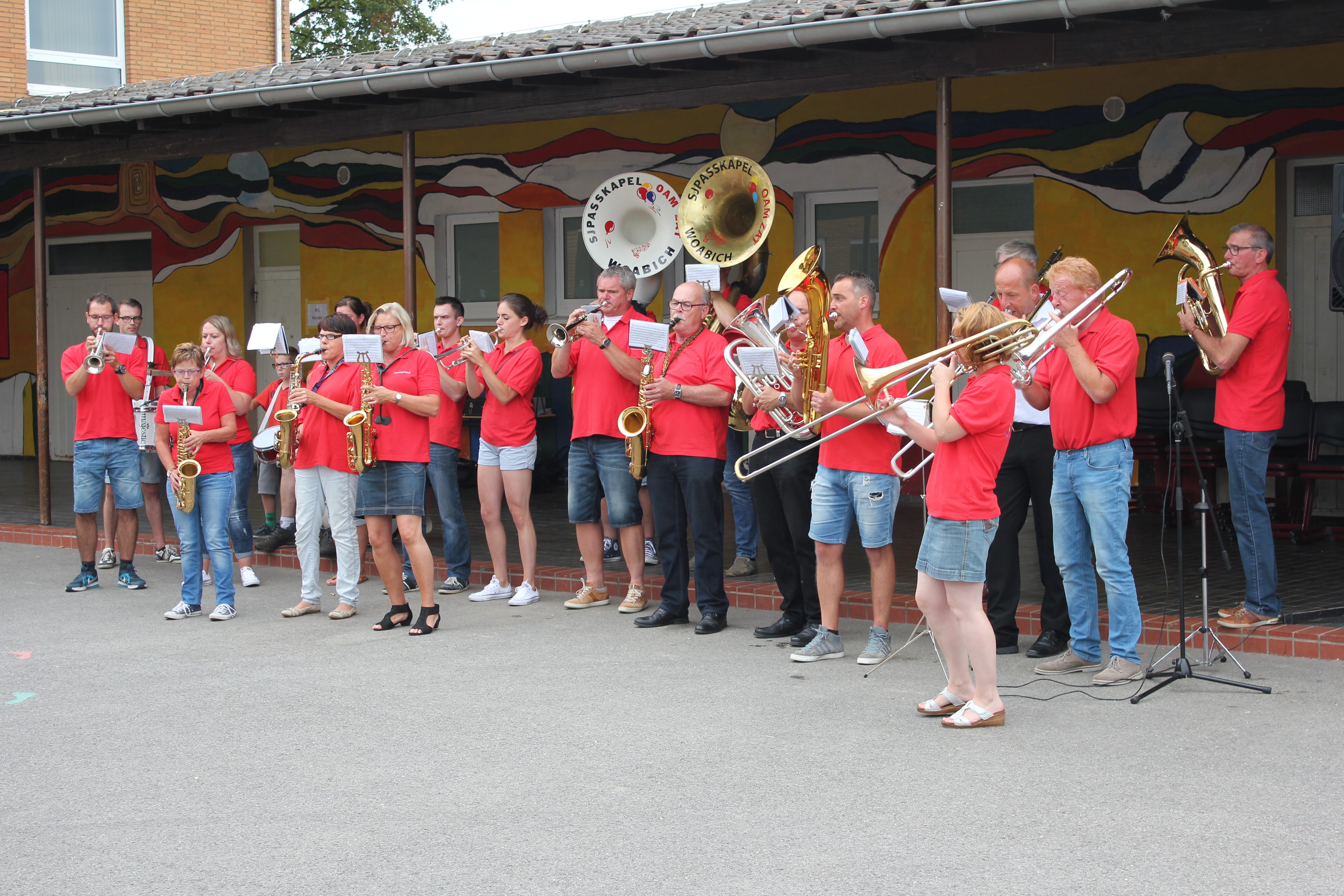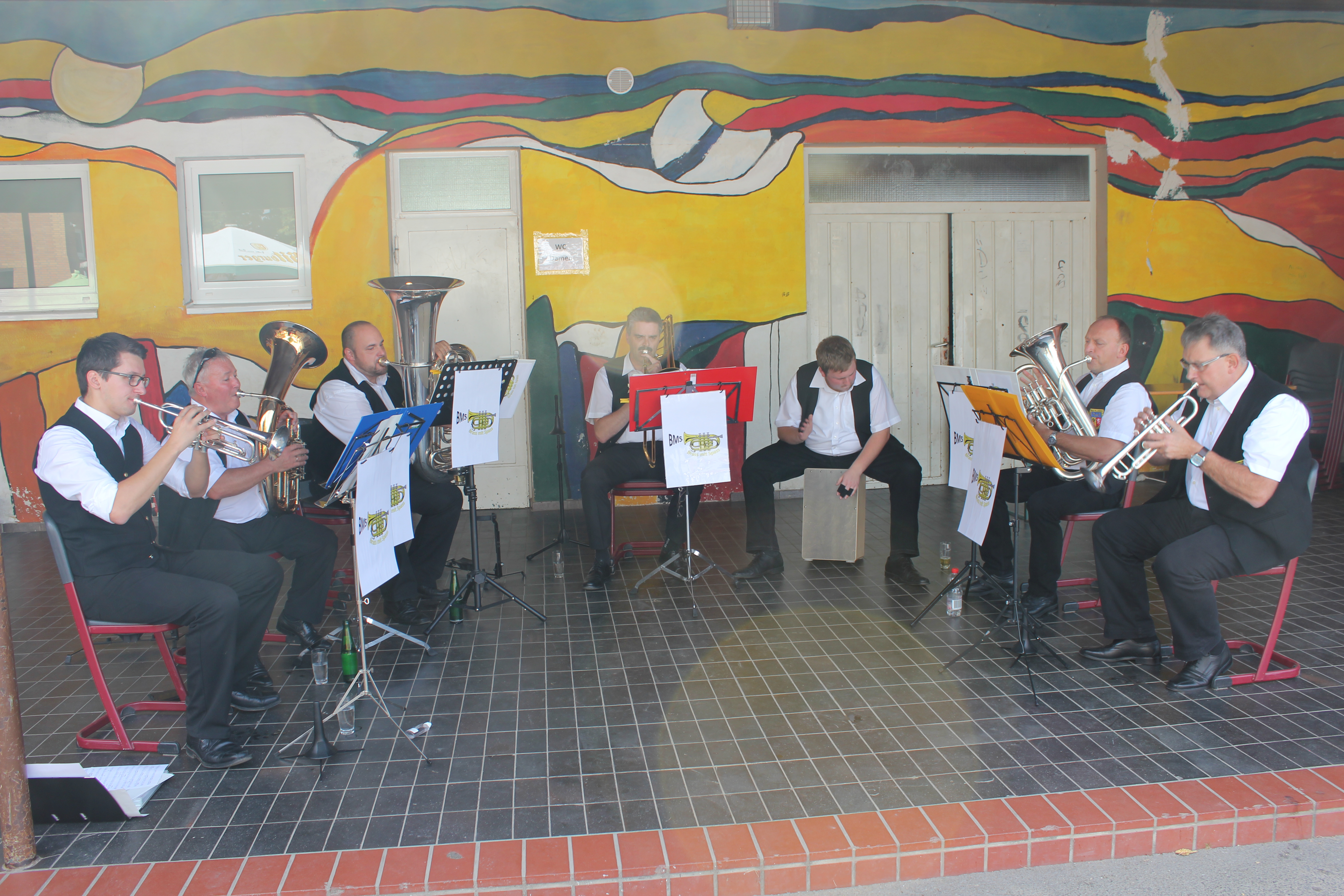 Am Sonntag wurde auf Altbewährtes zurückgegriffen. Nach einigen Jahren wurde wieder ein Wiesenfest auf dem Schulhof der Grundschule in Scherpenseel veranstaltet. Bei schönstem Wetter fanden nicht nur viele Scherpenseeler Ortseinwohner den Weg, sondern auch viele Freunde des Musikervereins schauten vorbei. Eröffnet wurde der Nachmittag mit viel Schwung von den Musikvereinen aus Schaufenberg und Teveren, die den musikalischen Auftakt des Musiknachmittags gestalteten. Im Anschluss übernahm die Combo „Brass mit Spaß“ der Privatmusikkapelle und begeisterte mit ihren Klängen die gesamte Zuhörerschaft. Auch die Musikerinnen und Musiker vom Instrumentalverein Herbach ließen es sich nicht nehmen, der Privat-Musikkapelle Scherpenseel musikalisch ihre Glückwünsche zu überbringen. Ein weiteres Highlight wartete am Ende des Nachmittags auf die vielen Gäste. Die Spaßkapelle aus dem niederländischen Waubach brachte beste Stimmung und Unterhaltung mit.