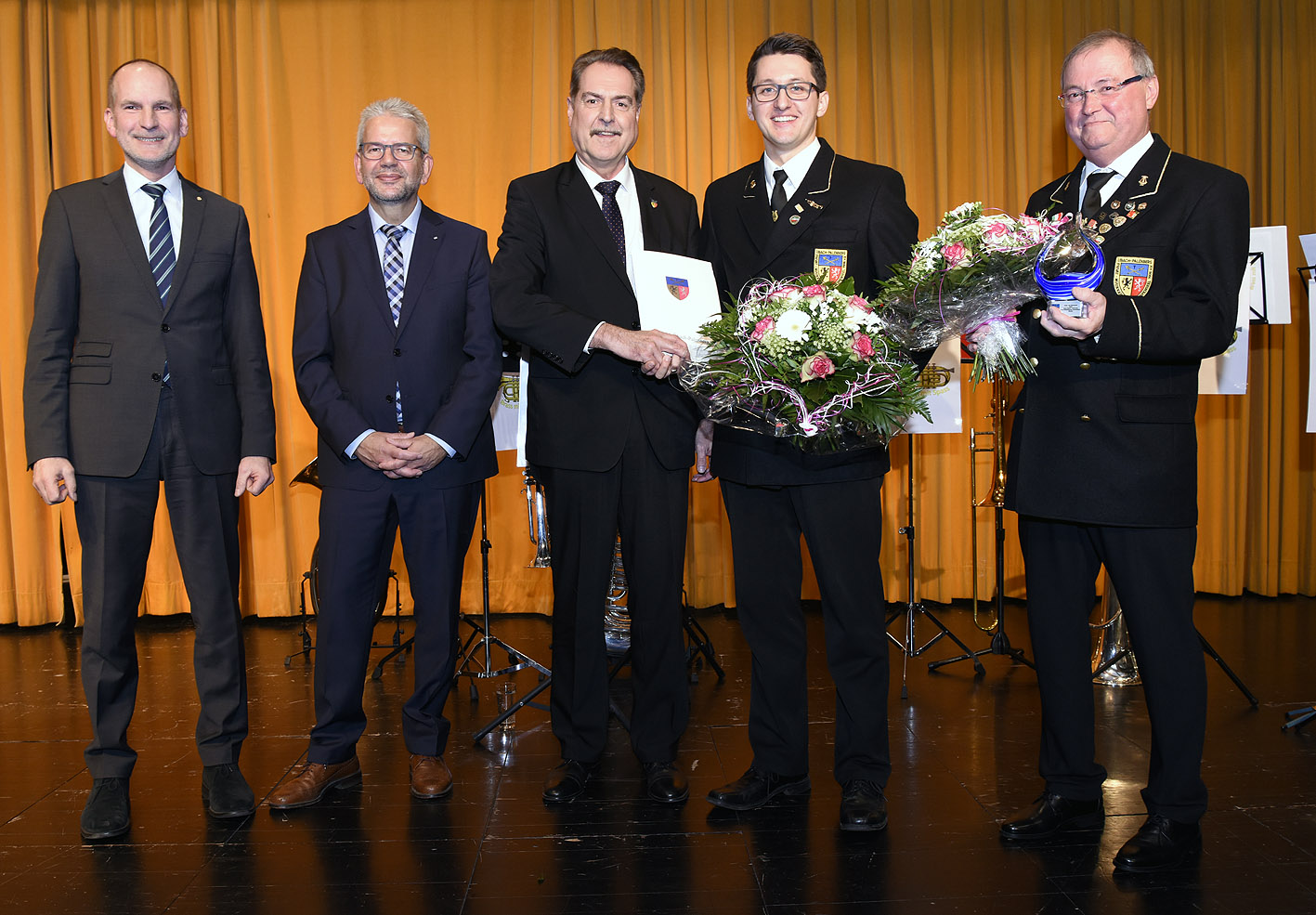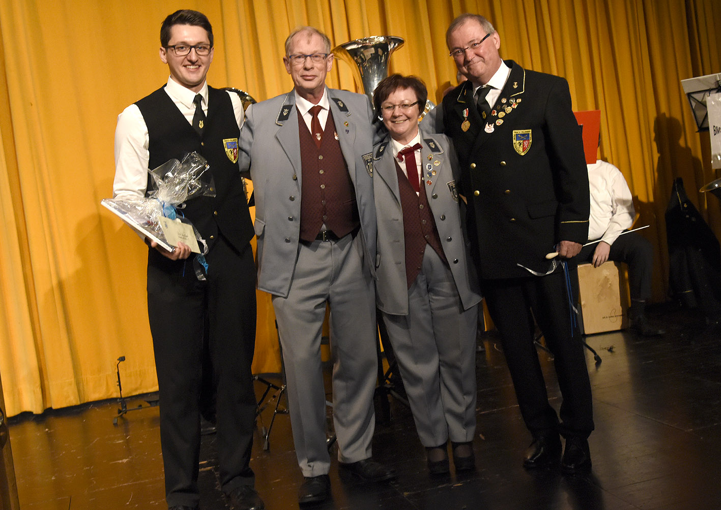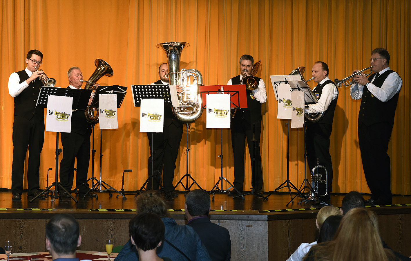Eine musikalische Antwort brachte die Musikkapelle im Rahmenprogramm der Preisverleihung. Auch wenn nicht das ganze Orchester auf der Bühne stand, verdeutlichte die Combo „Brass mit Spaß“ der Musikkapelle das breite Repertoire mit dem barocken „Trumpet Tune“ von Jeremiah Clarke als heroische Festmusik und dem rhythmischen „Soul Bossa Nova“ des Afro-Amerikaners Quincy Jonas. Eine weitere musikalische Farbe brachte Sarah Elena Esser mit ihrer kräftigen Pop-Stimme in die Veranstaltung. Akustisch begleitet von Yannik Richter an der Gitarre und Thomas Preuth an der Cajòn wurde Andreas Bouranis „Auf uns“ kurzerhand umgeschrieben und der Musikkapelle als Siegeshymne gewidmet.