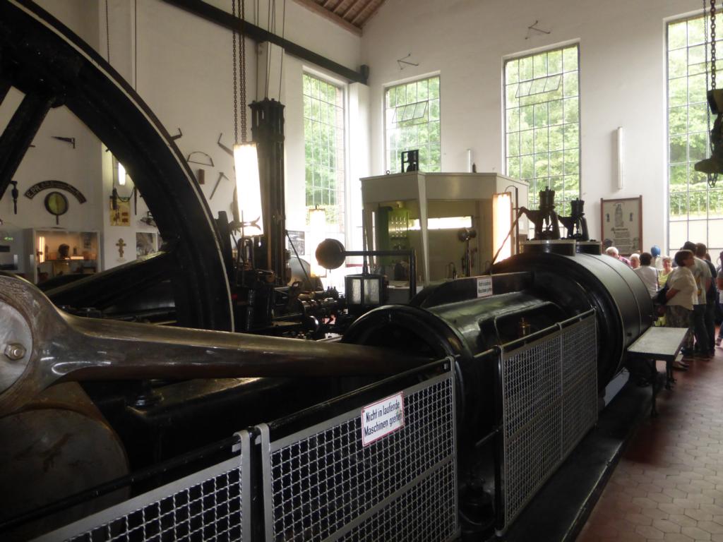 Nachdem sich alle gestärkt hatten ging es weiter mit einer Erklärung und Vorführung der historischen Dampfmaschine im Maschinenhaus des Bergbaudenkmals. Bei dieser Gelegenheit konnte auch geklärt werden, nach wem die Grube benannt wurde, nämlich nach Adolf Freiherr von Steffens.