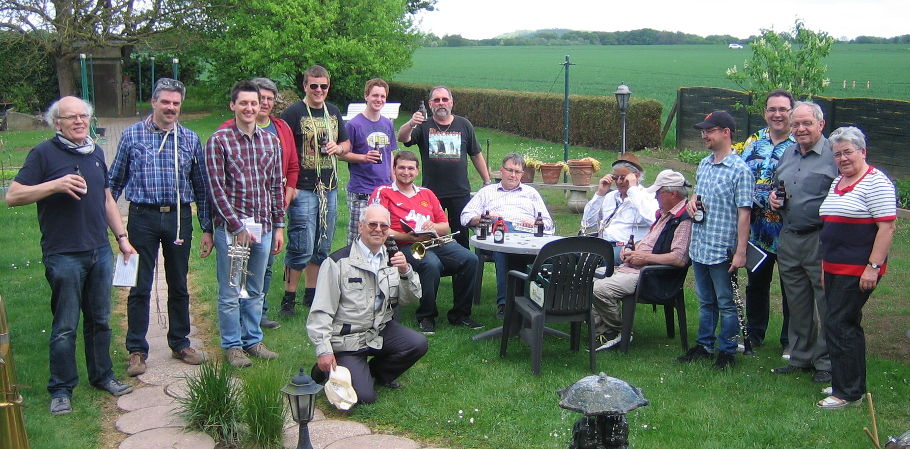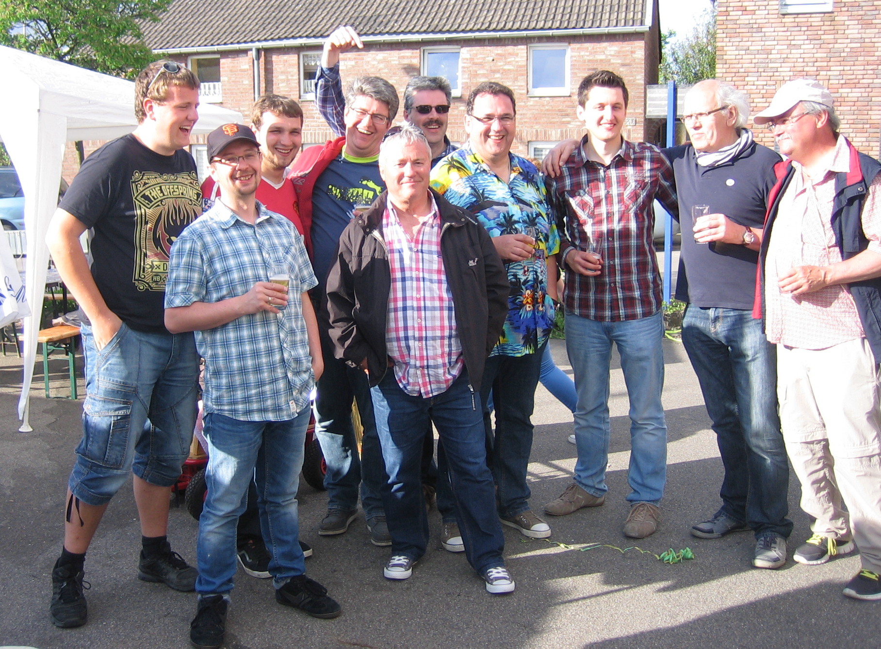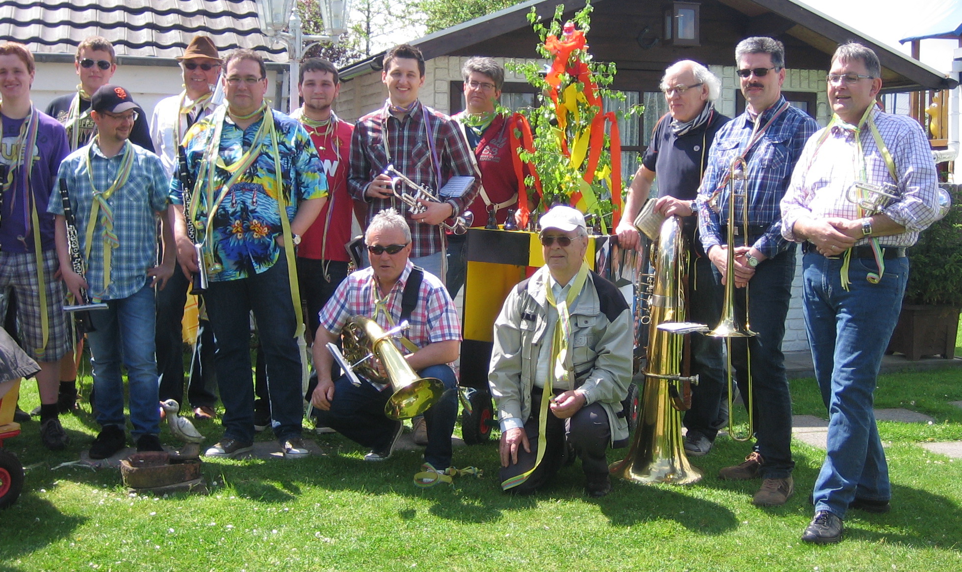 Um Mittag starteten 15 „Väter“, vom Vorsitzenden Norbert Preuth aus mit drei dekorierten Bollerwagen, beladen mit Instrumenten, Schlagzeug und flüssigem Proviant, zur gemütlichen, musikalischen Wanderung. Schon nach einigen hundert Metern kehrte die Truppe beim Ehrenvorsitzenden Gerhard Kochs und Ehefrau Hilde ein, um einen Mittags-Imbiss als Grundlage für die bevorstehende Tour einzunehmen. Einige Märsche gab es als Belohnung. Nachdem ein Bollerwagenreifen geflickt war, ging es durch die Felder nach Scherpenseel. Dort wurde Waltraud Moitroux, der ehemaligen Vereinswirtin, Franz und Margot Reinartz sowie den Eheleute Betsch vom Grenzlandhof ein Ständchen gebracht. Weiter ging es ins Unterdorf zum Dirigenten Günter Preuth, um Nachschub aufzutanken. Nächstes Ziel war unser Ehrenmitglied Franz Cleef, der erst morgens von seinem „Ständchenglück“ erfahren hatte. Der Ausklang der Tour fand in Windhausen beim dortigen Familienfest statt. Natürlich waren auch hier ein paar musikalische Akzente Pflicht. Alle Teilnehmer waren sich einig: Eine tolle Tour, viel gelacht und Spass gehabt und zur Wiederholung geeignet. Am frühen Abend wurde dann die meisten von ihren Partnerinnen, die sich zu „Kaffee und Kuchen“ getroffen hatten, abgeholt.