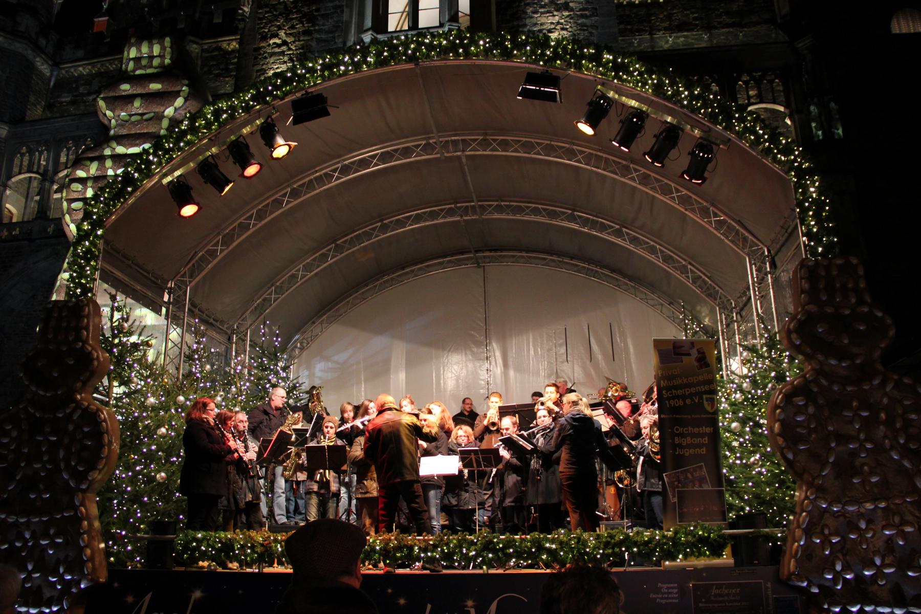 In stimmungsvoller Kulisse auf dem Aachener Katschhof zwischen Rathaus und Dom begeisterten die Musikerinnen und Musiker der Privat-Musikkapelle Scherpenseel auch in diesem Jahr wieder die Besucher des Aachener Weihnachtsmarktes. Bereits zum dritten Mal gastierte der Musikverein hier zur Gestaltung des musikalischen Rahmenprogramms und konnte erneut sein musikalisches Können über die Stadtgrenzen hinaus unter Beweis stellen.